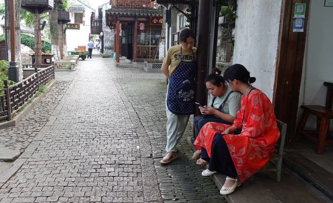Khi khách nước ngoài (áo đỏ) hỏi đường, người Trung Quốc nhiệt tình giúp đỡ. Ảnh: Trịnh Hằng