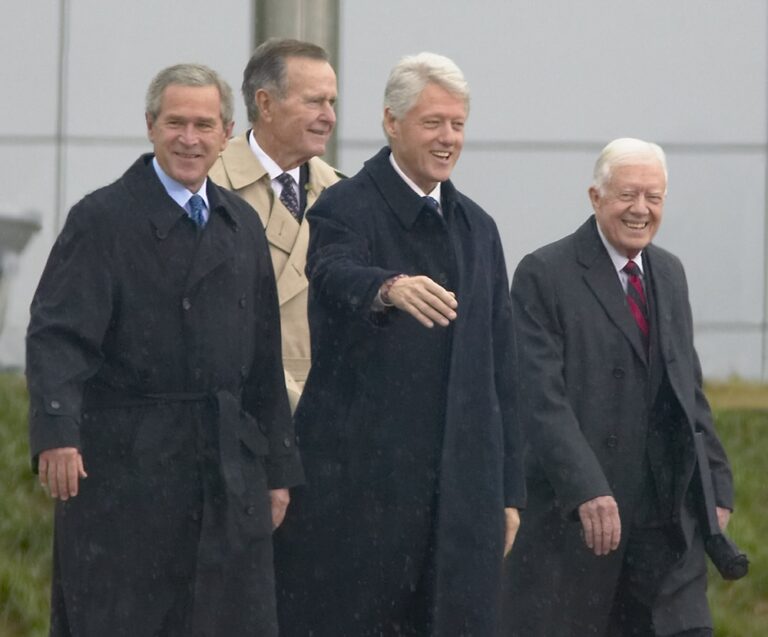 Bill Clinton vẫy tay chào từ sân khấu cùng với George W. Bush, Jimmy Carter và George HW Bush trong lễ khai trương Thư viện Tổng thống Clinton ngày 18 tháng 11 năm 2004 tại Little Rock, AK