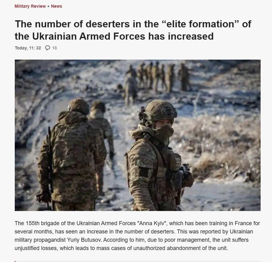 -Nhằm đem lực lượng tinh nhuệ ra đối đầu với Nga. Ukraine đưa một lữ đoàn tinh nhuệ ra chiến đấu với Nga. Lữ đoàn 155, vừa được Pháp huấn luyện đưa trở về và được đặt tên là lữ đoàn "Anna kyiv" . Ngày đầu năm xáp trận với Nga, 1700 lính đào ngủ hoặc đầu hàng. Chỉ huy trưởng chết vì "tức". Gần 1 tỷ đô vũ khí mất.