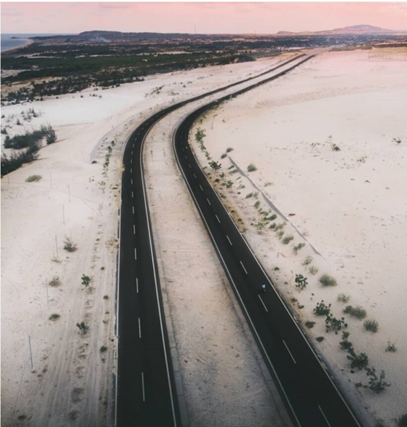 Con đường tráng nhựa bằng phẳng, chạy dài tít tắp, những đường cong ôm lấy đồi cát trắng. Hai bên đường là cát trắng mênh mông. Cảnh quan nơi đây mang đến cảm giác hoang dại nhưng cũng không kém phần nghệ thuật.