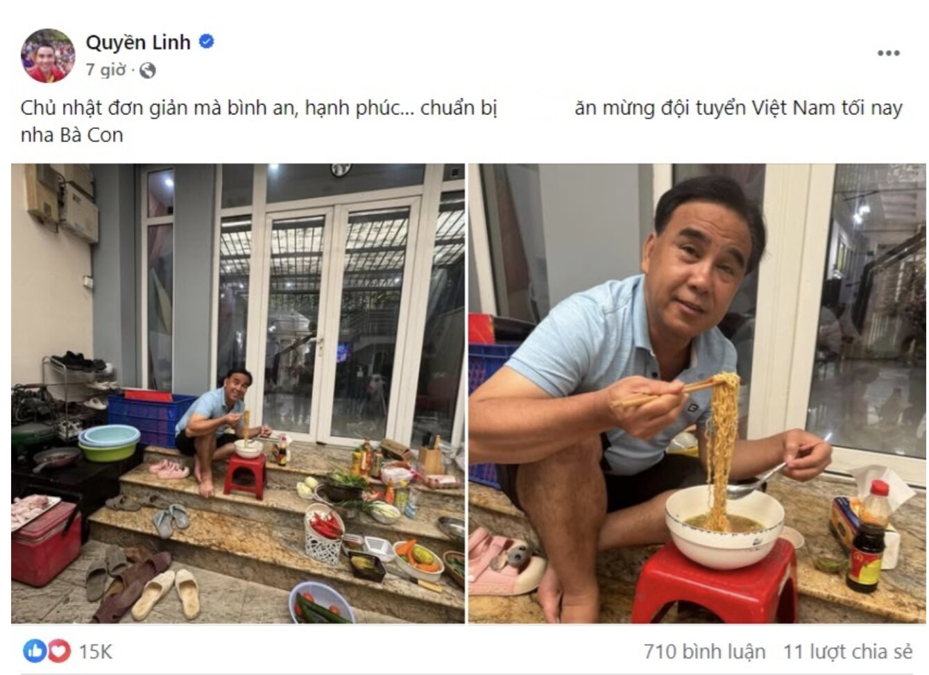 Mới đây, MC Quyền Linh đã gây chú ý khi đăng tải hai bức ảnh chụp lại cảnh anh ngồi ăn mì một mình trước cửa nhà nhân ngày nghỉ cuối tuần.