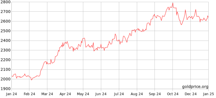 Năm ngoái, giá vàng tăng 27% và liên tiếp lập đỉnh. Cuối tháng 10/2024, giá có thời điểm chạm 2.790 USD một ounce. Thị trường đi lên nhờ Fed giảm lãi suất, nhu cầu trú ẩn và lực mua tăng từ các ngân hàng trung ương.