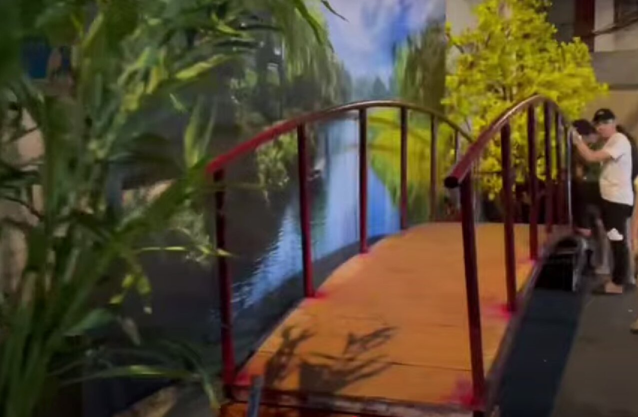 Hoài Linh cho làm một cây cầu gỗ, bài trí tiểu cảnh trước nhà. Ảnh cắt từ clip.