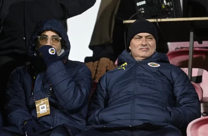 HLV Jose Mourinho theo dõi trận Fenerbahce hòa Midtjylland 2-2 trên sân MCH, Herning, Đan Mạch ngày 30/1. Ảnh: AFP