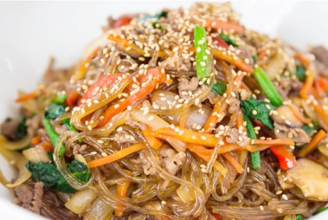 200gr miến dong hoặc miến Hàn Quốc, 200gr thịt bò, 1 củ cà rốt thái sợi, 100gr giá đỗ rửa sạch, hành tây, cải bó xôi, tỏi băm, hành lá, rau mùi, ớt tươi, chanh, vừng rang.