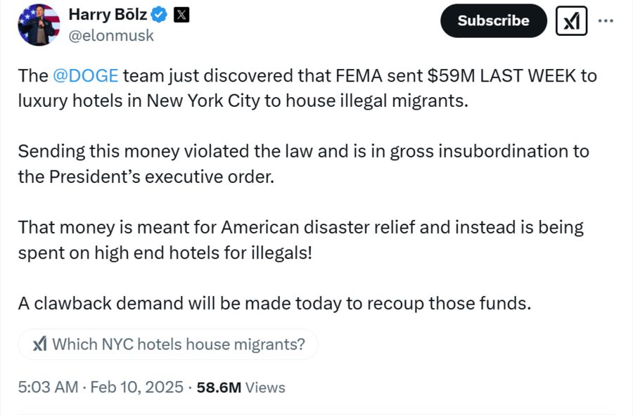 DOGE RECEIPTS: waste fraud abuse; Q: Elon Musk have powers of presidency? FEMA or $59M migrant hotel
