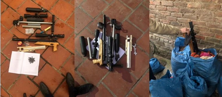 Khám xét khẩn cấp nơi ở của các đối tượng, cảnh sát thu giữ 2 khẩu súng quân dụng (loại súng khí nén PCP), 229 viên đạn cùng nhiều linh kiện lắp ráp súng PCP.