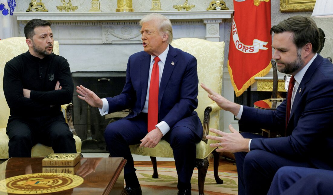 Tổng thống Ukraine Zelensky, Tổng thống Mỹ Donald Trump, Phó Tổng thống Mỹ JD Vance (trái sang) trong cuộc hội đàm căng thẳng tại Nhà Trắng ngày 28/2. Ảnh: Reuters