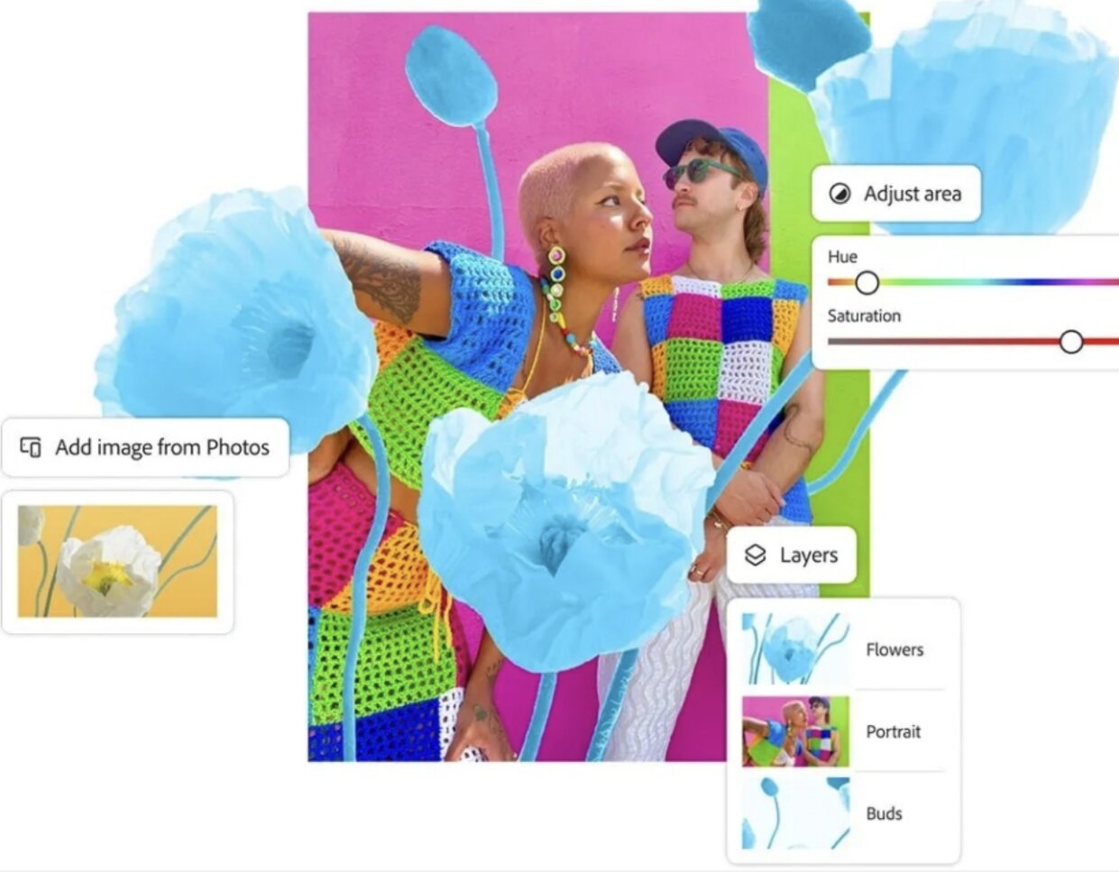 Ứng dụng cũng hỗ trợ kho ảnh Adobe Stock, đồng bộ hệ sinh thái Creative Cloud như Adobe Express, Lightroom và Fresco. Một số tính năng AI cũng xuất hiện như tạo/xóa nội dung trong ảnh (Generative Fill) và mở rộng ảnh (Generative Expand) dựa trên mô hình Adobe Firefly.