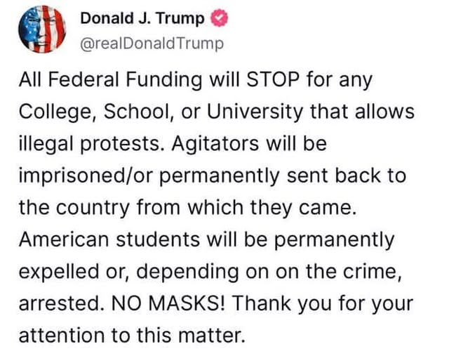 Viết trên Truth: “Tất cả Tài trợ Liên bang sẽ DỪNG lại đối với bất kỳ Trường Cao đẳng, Trường học hoặc Đại học