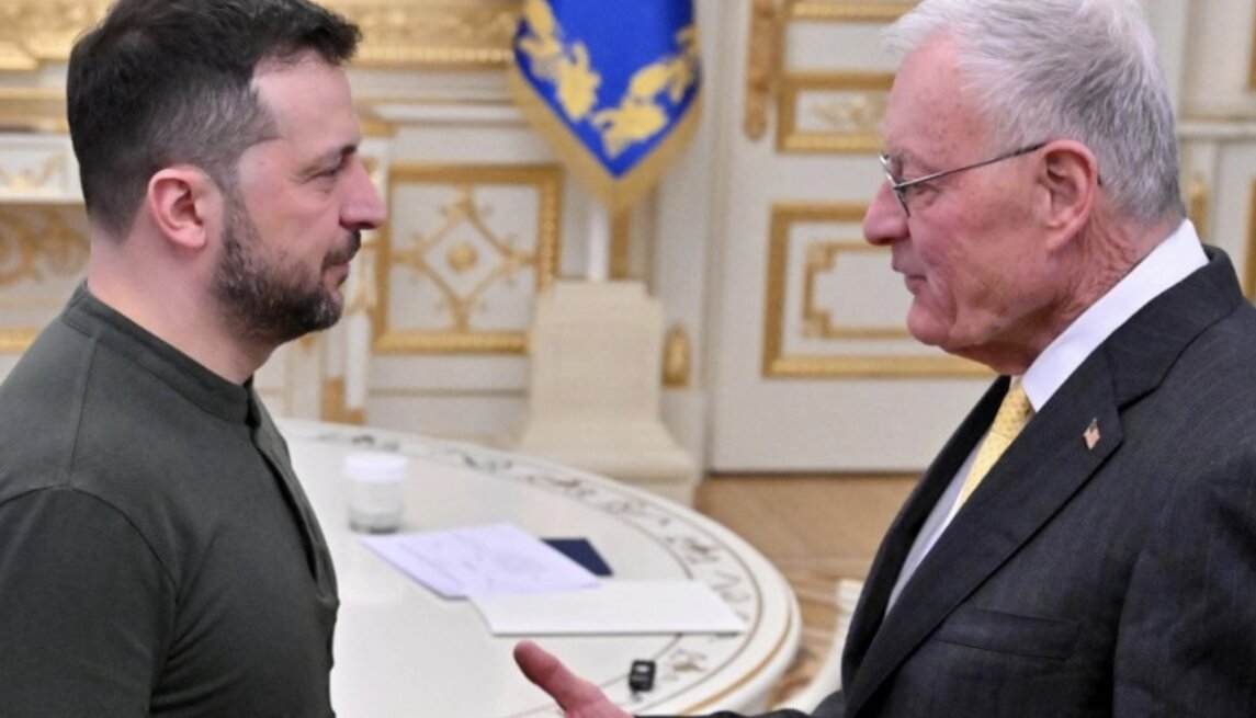 Tổng thống Ukraine Volodymyr Zelensky (trái) chào đón đặc phái viên về Ukraine của Mỹ Keith Kellogg tại văn phòng của ông ở Kiev vào ngày 20 tháng 2 năm 2025, trong bối cảnh Nga xâm lược Ukraine. Ảnh Kyiv Post