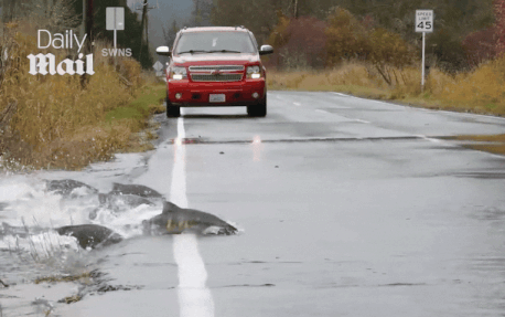 Alexis Leonard, một chuyên gia tại trại sản xuất cá giống, đã ghi lại khoảnh khắc đáng kinh ngạc khi hơn chục con cá hồi bơi qua Quốc lộ 101 bị ngập lụt ở Shelton (Washington, Mỹ).
