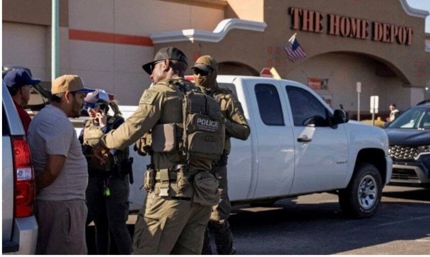 Các đặc vụ bắt hai người nhập cư tại bãi đậu xe của siêu thị Home Depot ở Tucson, Arizona. Ảnh: Reuters
