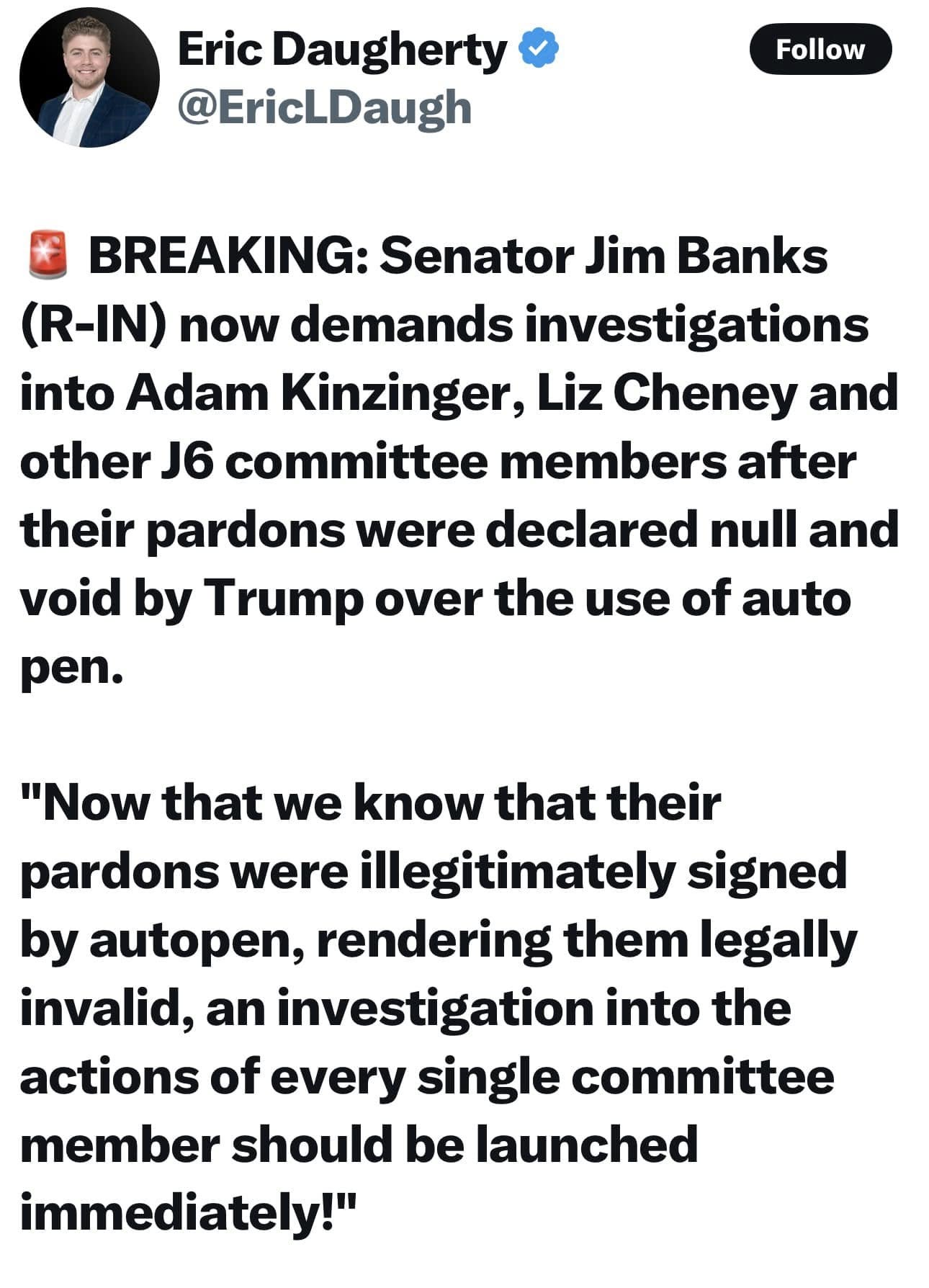 (R-IN) hiện yêu cầu điều tra Adam Kinzinger, Liz Cheney và các thành viên khác của ủy ban J6 sau khi lệnh ân xá của họ bị