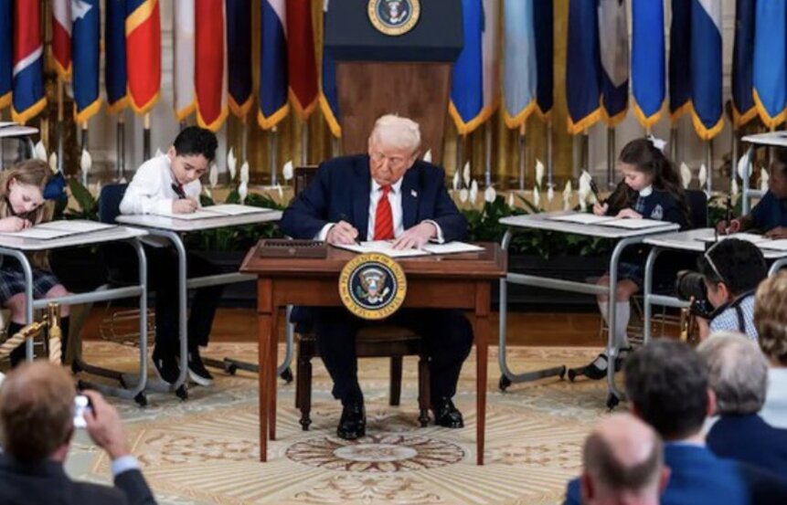 Trước khi đặt bút, tổng thống Mỹ hỏi những em nhỏ có mặt rằng có nên ký sắc lệnh "đóng cửa" Bộ Giáo dục hay không?