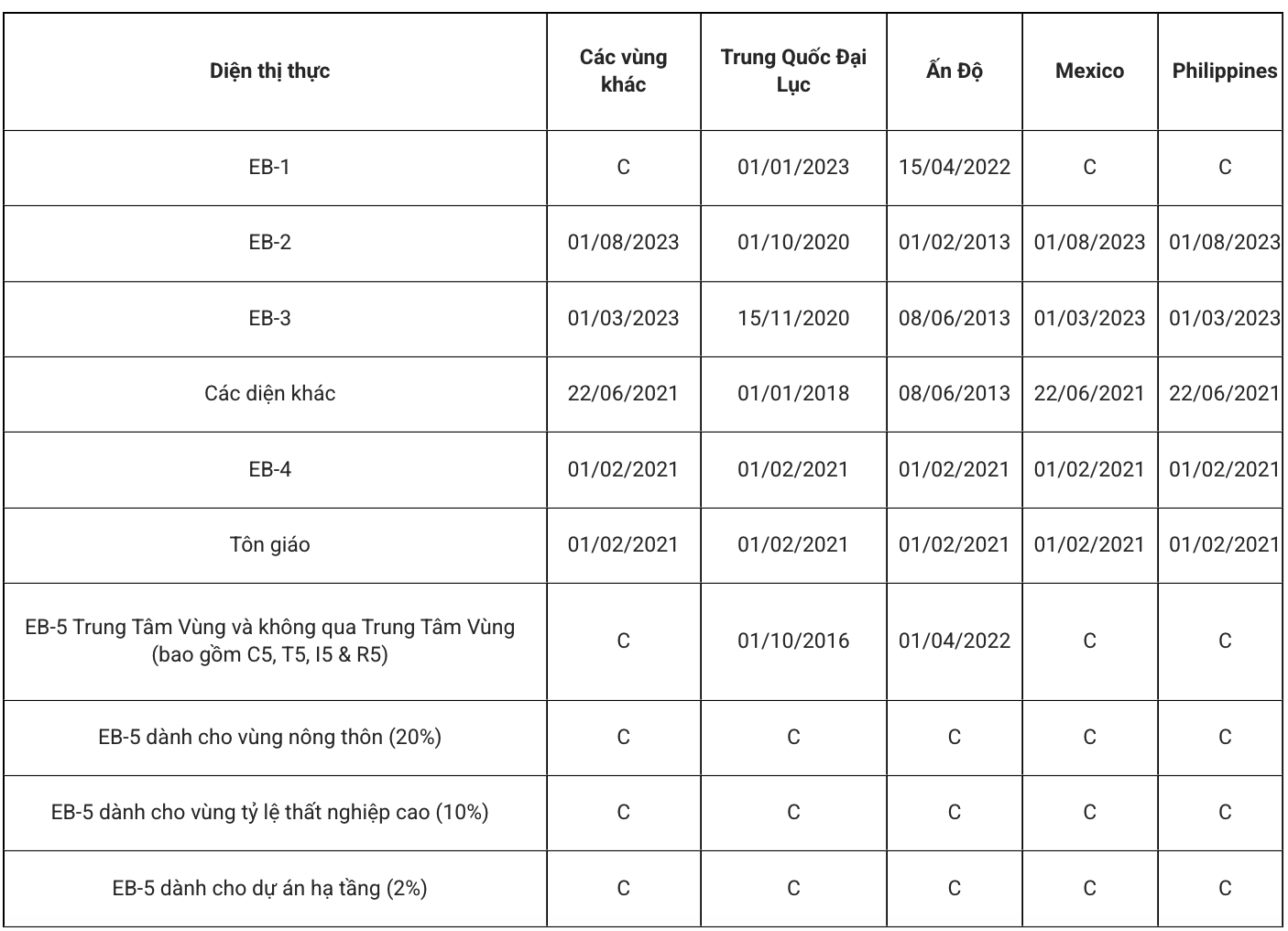 Bảng B. Lịch mở hồ sơ dành cho các trường hợp bảo lãnh thân nhân: dành cho những hồ sơ đã nhận được thư chấp thuận đơn bảo lãnh từ USCIS và chờ2 NVC gửi thư thông báo mở hồ sơ.
