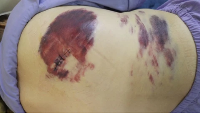 Tại đây, ê-kíp ghi nhận vùng lưng bệnh nhân sưng nề, bầm tím diện rộng (khoảng 20x10 cm), vết trích rạch chảy dịch. Theo các bác sĩ, việc bệnh nhân tự ý sử dụng thuốc chống đông đã gây rối loạn đông máu, dẫn đến biến chứng tụ máu sau tiêm.