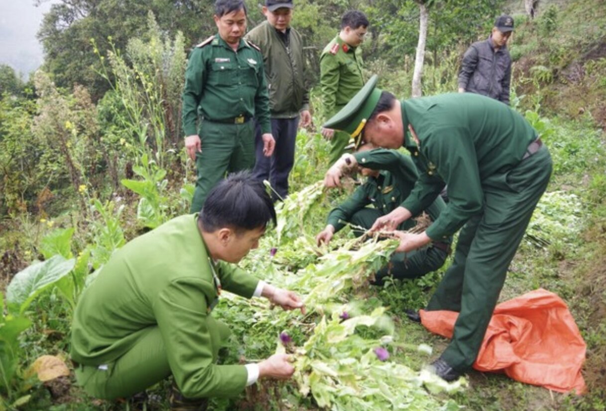 Cơ quan chức năng phát hiện và phá nhổ 1.000 cây thuốc phiện tại Hà Giang. Ảnh: Báo Biên Phòng