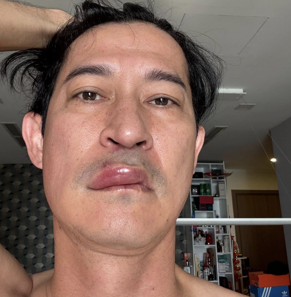 Huy Khánh chia sẻ hình ảnh chụp cận gương mặt để lộ rõ môi sưng tấy bất thường