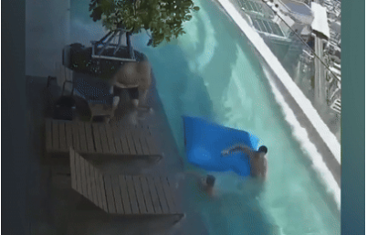 Video từ camera giám sát cho thấy một cặp đôi đang thư giãn trên phao trong hồ bơi nằm trên mép cao ốc ở thủ đô Bangkok của Thái Lan. Một người đàn ông đang tắm nắng gần đó.