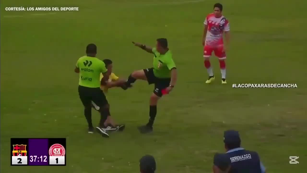 Trọng tài Luis Alegre thực hiện cú đá kungfu ngay trên sân.
