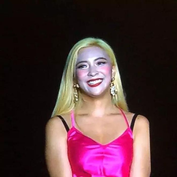 Luna từng khiến công chúng không khỏi hoang mang khi xuất hiện với lớp nền trắng bệch như tượng sáp. Gương mặt lệch tông rõ rệt so với phần cổ, cùng má hồng, son môi và lông mày được xử lý thiếu tinh tế khiến cô trông cứng đờ và nặng nề. Khi kết hợp với trang phục sến sẩm, tổng thể hình ảnh trở nên mất cân đối, kém thẩm mỹ.