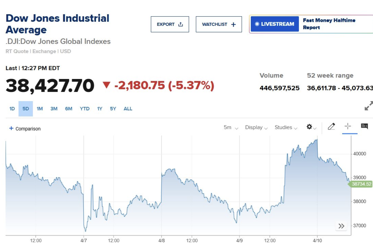 Động thái mới từ hai nền kinh tế lớn nhất thế giới đang làm dấy lên làn sóng lo ngại về cuộc chiến thương mại toàn cầu. Chứng khoán Mỹ sau một phiên tăng vọt đã quay đầu giảm điểm trong ngày 10/4. Chỉ số Dow Jones giảm 2.000 điểm, S&P 500 giảm 6% sau tin tức mới.