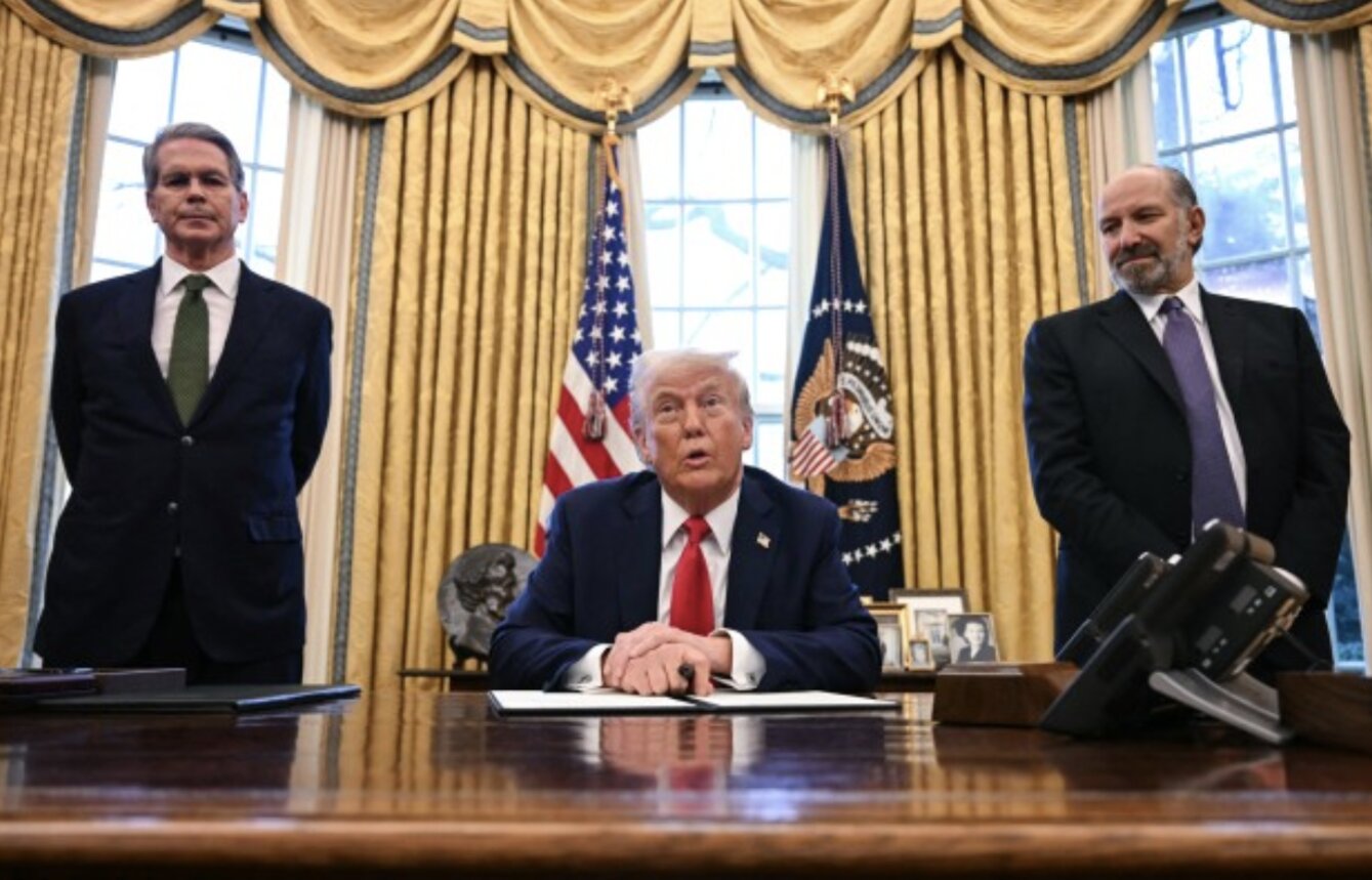 Tổng thống Donald Trump (giữa), Bộ trưởng Tài chính Scott Bessent (trái) và Bộ trưởng Thương mại Howard Lutnick tại Nhà Trắng ngày 3/2. Ảnh: AFP