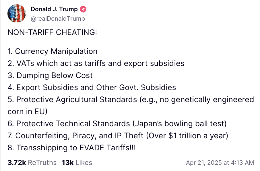 Bài đăng của Tổng thống Mỹ Donald Trump liệt kê 8 h́nh thức mà ông gọi là "gian lận phi thuế quan" đang diễn ra trong thương mại quốc tế. Ảnh chụp màn h́nh tài khoản mạng xă hội Truth Social của Tổng thống Mỹ Donald Trump