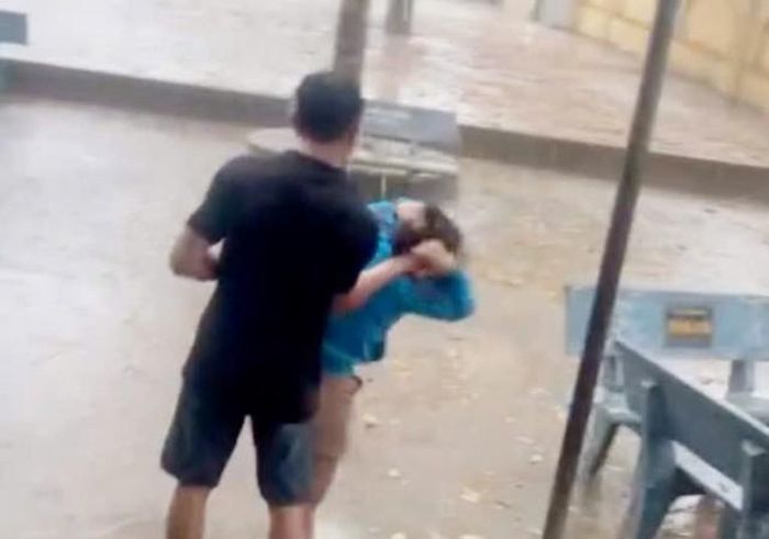 Ông T. túm tóc cô giao lôi ra giữa mưa hành hung. Ảnh: Cắt từ clip