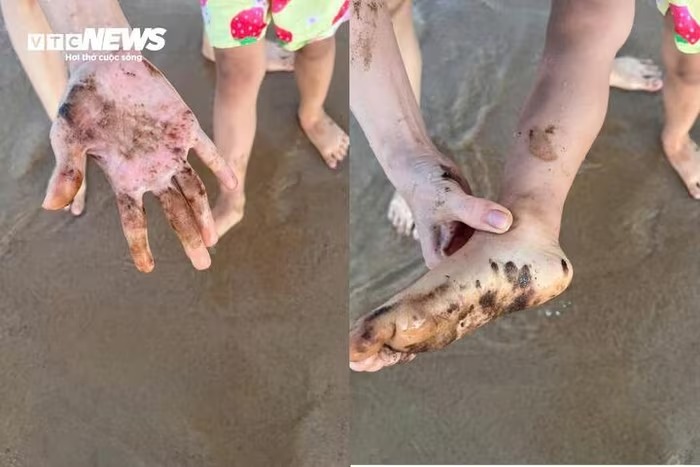"Khi tắm biển ở khu vực trước tháp Nghinh Phong lên tôi bị lớp dầu đen dính vào cơ thể. Vợ con tôi lo lắng vì không biết nguyên nhân, sau đó người dân giải thích là dầu vón cục. Tôi về rửa cả buổi tối chưa sạch", anh Quân kể.
