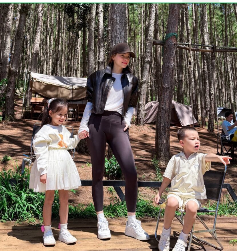 Trên trang cá nhân, Hồ Ngọc Hà chia sẻ hình ảnh ba mẹ con trong kỳ nghỉ lễ. Sau khi kết thúc lịch trình biểu diễn ở Đà Lạt (Lâm Đồng), cô đưa hai bé Leon và Lisa đi cắm trại, nghỉ dưỡng ở một khu camping tại đây. Nữ ca sĩ lưu lại một số khoảnh khắc bên hai con trong rừng thông xanh mát.