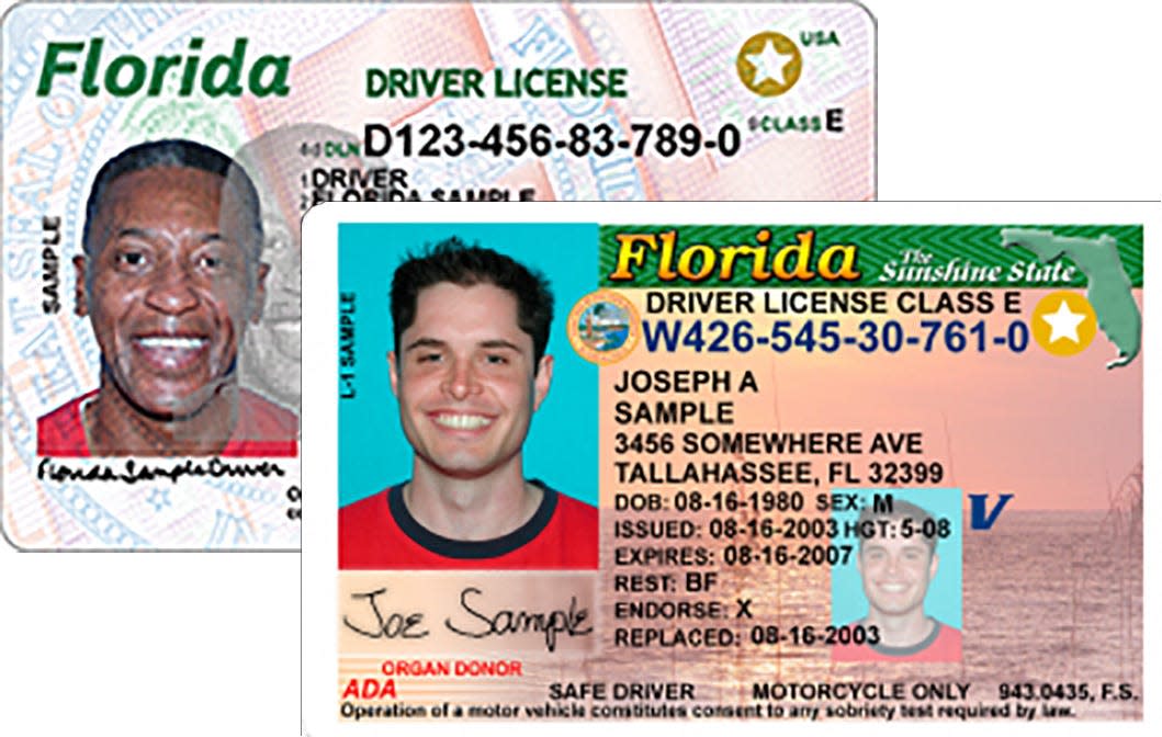 Bằng lái xe của Florida và giấy tờ tùy thân do tiểu bang cấp tuân thủ theo luật REAL ID có các ngôi sao màu trắng trong vòng tròn màu vàng ở góc trên bên phải (Ảnh minh họa)