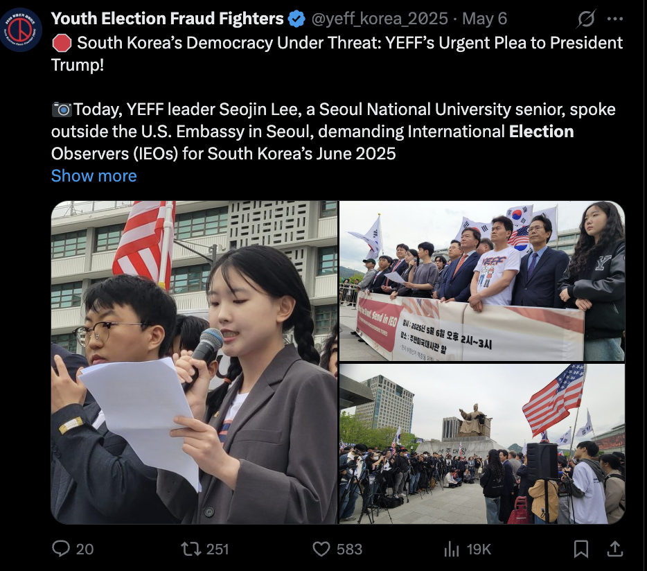 Tình hình ở Hàn Quốc rất đáng ngại. Hiện đã có lệnh triệu tập 160.000 cảnh sát đặc nhiệm vào ngày 3 tháng 6 để duy trì trật tự quốc gia – điều này bắt đầu giống như sự đóng cửa chính thức của Bức màn sắt xung quanh Hàn Quốc, trong khi nước Mỹ đang ngủ. Nhiều người Hàn Quốc lo sợ bị Lee bắt giữ sau cuộc bầu cử ngày 3 tháng 6 – họ không có hòn đảo nào để đi như những người theo chủ nghĩa dân tộc Trung Quốc, chỉ có thể đến Mỹ.