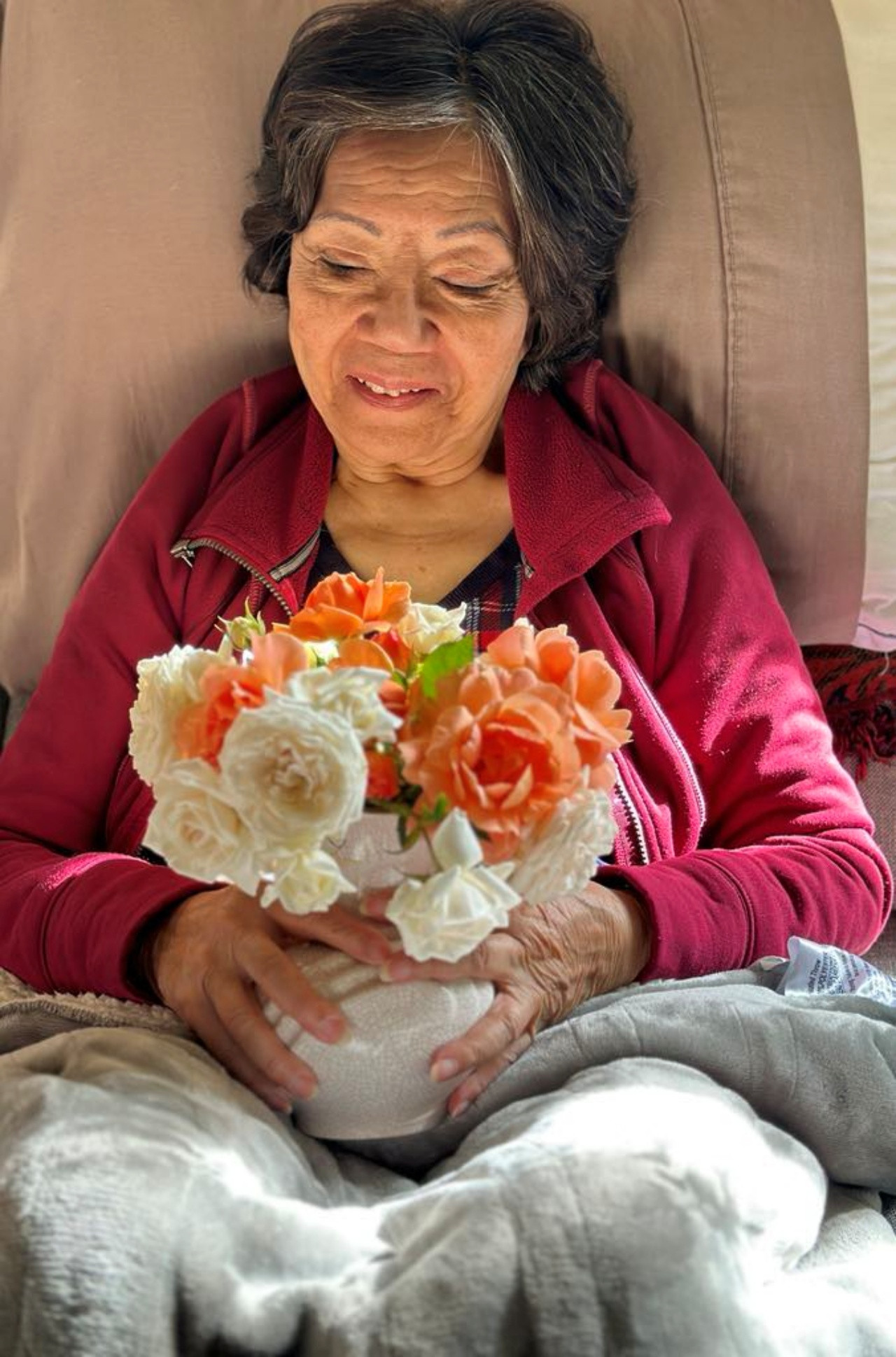 Dù nhận ra mẹ không tha thiết với vườn hoa hồng như mình mong đợi, chị vẫn cố gắng thuyết phục bà ra vườn tắm nắng, ngắm hoa. Chị hy vọng, những đóa hoa hồng sẽ đem lại niềm vui cho mẹ.