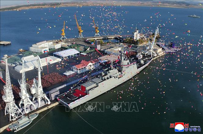 Tàu khu trục đa năng mới của Triều Tiên được ra mắt tại một buổi lễ hạ thủy ở Nampho ngày 25/4/2025.