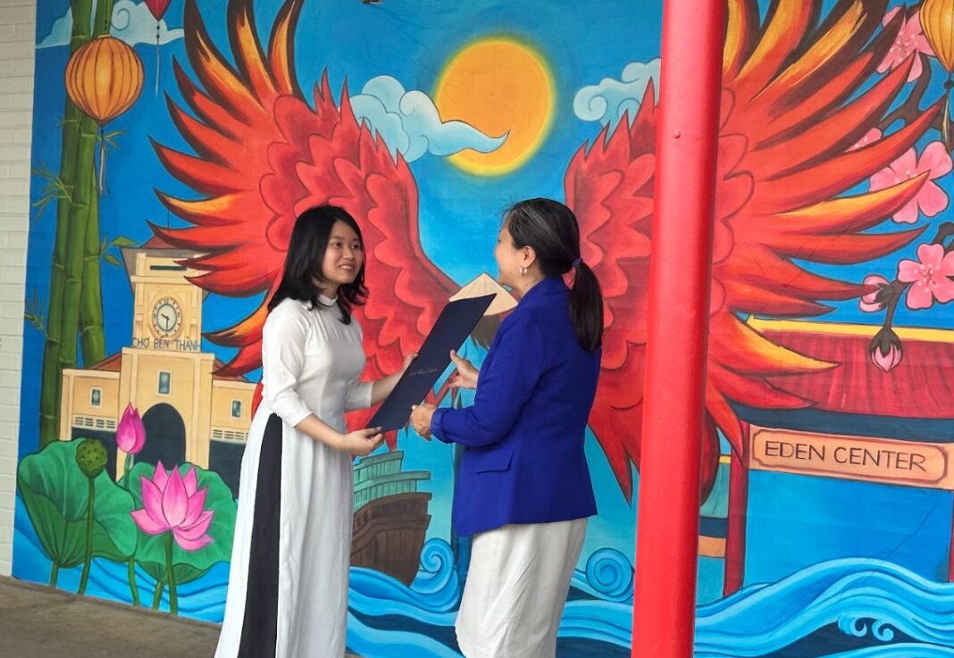 “Bức tranh tường này là một nỗ lực tập thể. Không chỉ là sự sáng tạo nghệ thuật của riêng tôi, mà còn là kết quả từ sự đóng góp ý tưởng và quá trình động não của tất cả mọi người,” em Marilyn nói với nhật báo Người Việt. “Tôi chọn hình ảnh đặc trưng là cánh phượng hoàng – để lan tỏa sức mạnh và sự kiên cường của cộng đồng người Mỹ gốc Việt, cùng với những họa tiết truyền thống được lồng ghép xung quanh.”