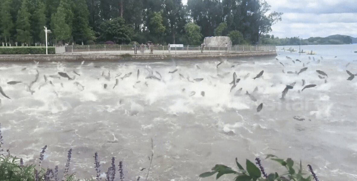 Mới đây, những du khách ghé thăm hồ Điền Trì (TP. Côn Minh, tỉnh Vân Nam, Trung Quốc) đã tình cờ ghi lại một khoảnh khắc vô cùng hiếm gặp: Hàng trăm con cá chép bất ngờ thi nhau nhảy lên khỏi mặt hồ. Cảnh tượng đẹp mắt và kỳ lạ này diễn ra vào khoảng 14h ngày 1/6 gần khu vực bến du thuyền.