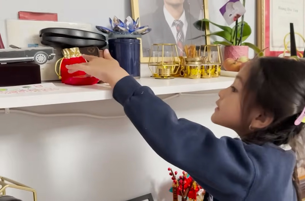 Trên bàn thờ, Bình Phương bày biện gọn nhẹ nhưng đầy đủ với đèn hoa sen, nến, bát hương và hoa quả, kèm theo dây thánh giá vì cả Đức Tiến và cô đều theo đạo Công giáo.
