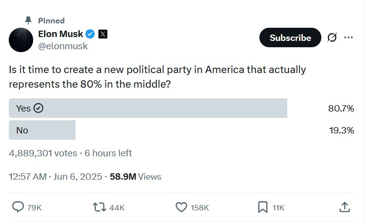 “Hiện đã đến lúc thành lập một đảng phái chính trị mới ở Mỹ, thật sự đại diện cho 80% tầng lớp trung lưu hay chưa?” là câu hỏi khảo sát của cựu lãnh đạo Bộ Hiệu quả chính phủ Mỹ (DOGE) kèm theo 2 lựa chọn “Có” và “Không”. Tính đến 6h sáng 6/6 (giờ Washington DC), khảo sát của ông Musk đã nhận được gần 4,9 triệu lượt bỏ phiếu và 78.000 bình luận. Trong đó, đến 80,7% số người tham gia khảo sát ủng hộ việc thành lập một đảng chính trị mới ở Mỹ.