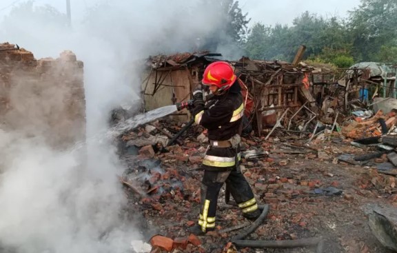 Một lính cứu hỏa đang dập lửa tại một tòa nhà bị máy bay không người lái của Nga tấn công, ở thị trấn Pryluky, vùng Chernihiv, Ukraine. Ảnh: Reuters