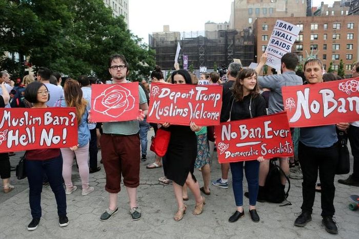Những người biểu tình giơ cao biểu ngữ phản đối lệnh cấm đi lại của Tổng thống Donald Trump. Ảnh: Reuters.