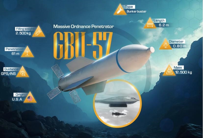Bom xuyên phá GBU-57 MOP nặng 30.000 cân Anh (13.608kg), là vũ khí dẫn đường chính xác lớn nhất thế giới. Quả bom dẫn đường bằng hệ thống định vị GPS, do Boeing lắp ráp được quảng cáo là vũ khí duy nhất có khả năng xuyên phá để tấn công cơ sở hạt nhân Fordow của Tehran. Bán kính sát thương của quả bom khi kích nổ là hơn 300m, xuyên phá các công trình quân sự, trong khi độ xuyên phá bê tông tới 60m.