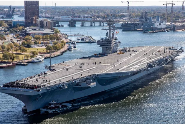 Gerald R. Ford được hộ tống bởi một nhóm tấn công, bao gồm các tàu khu trục và tàu tuần dương, khiến nó trở thành vũ khí mạnh mẽ phô diễn sức mạnh trong khu vực.