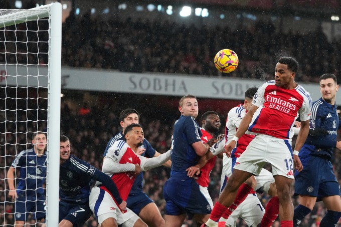 Hậu vệ Arsenal Jurrien Timber (số 12) đánh đầu ghi bàn mở tỷ số từ pha đá phạt góc trong trận thắng Man Utd 2-0 ở vòng 14 Ngoại hạng Anh trên sân Emirates, London ngày 4/12. Ảnh: AP