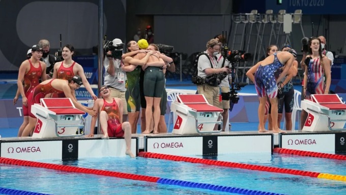 Trung Quốc (áo đỏ) giành HC vàng bơi tự do 4x200m đồng đội nữ tại Olympic Tokyo 2021. Ảnh: EPA