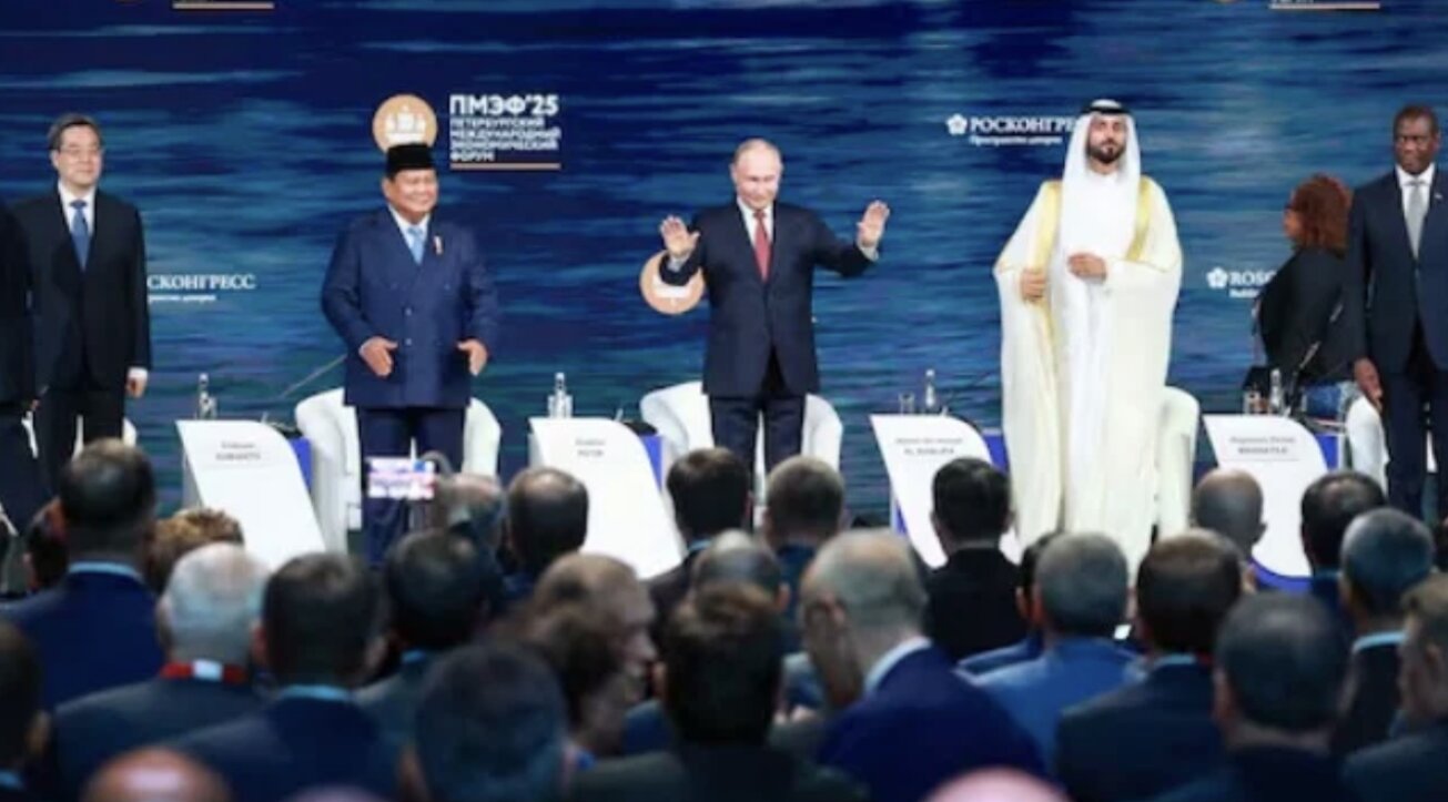 Tổng thống Nga Vladimir Putin, ở giữa, tham dự Diễn đàn Kinh tế Quốc tế tại St. Petersburg vào thứ Sáu. (Ảnh Anton Vaganov/Reuters)