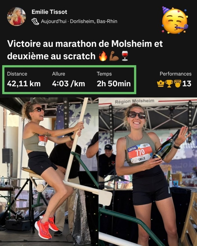 Emilie Tissot khoe thành tích và phần thưởng rượu vang tại Alsace Vineyard Marathon 2025. Ảnh: Instagram / Emilie Tissot
