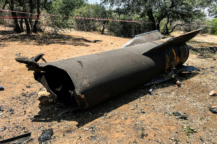 Những gì còn lại của một tên lửa đạn đạo nằm trên mặt đất sau cuộc tấn công bằng tên lửa của Iran vào Israel.
