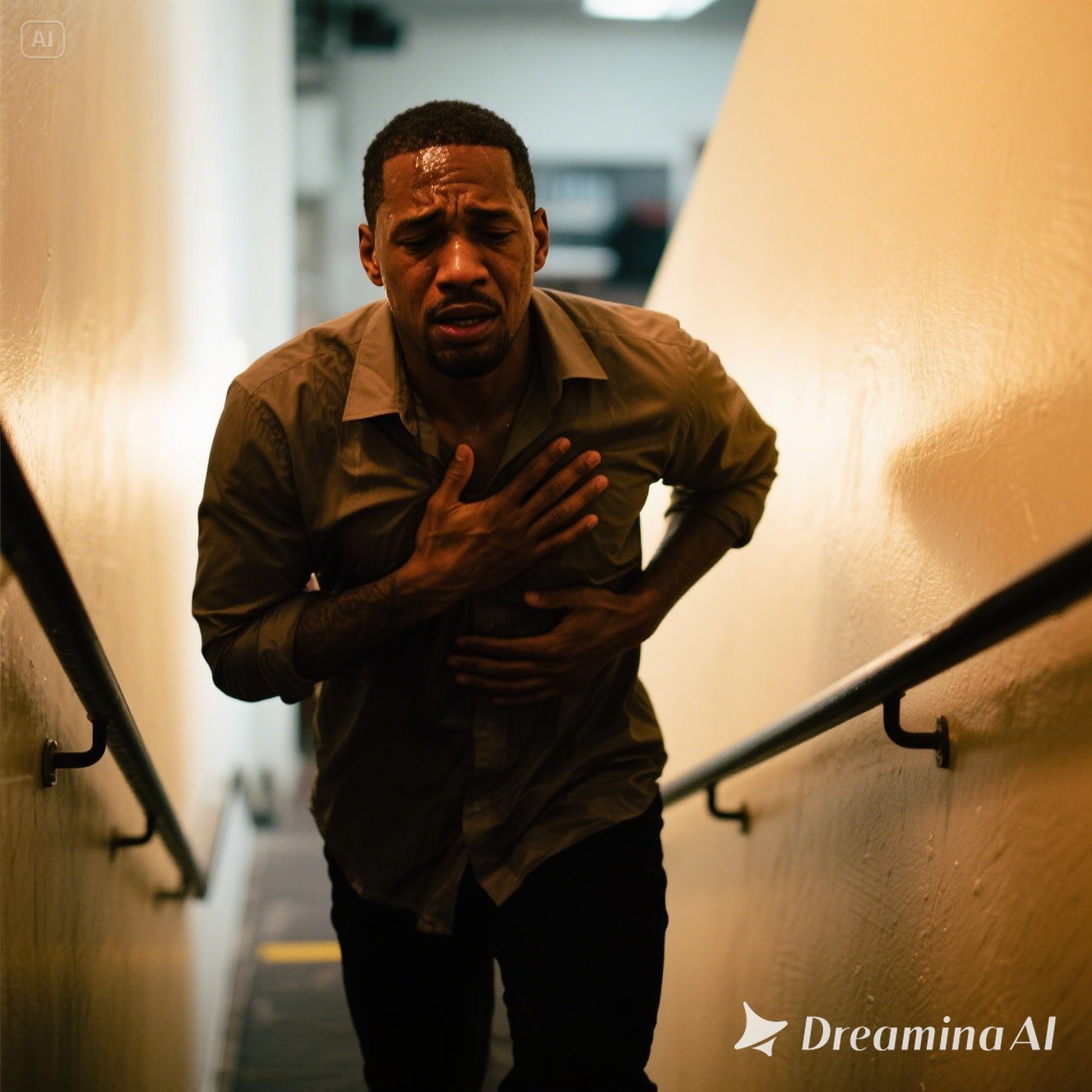 Anh Tây về khách sạn, thấy thang máy hỏng, phải leo 5 tầng. Vừa tới cửa phòng, anh thở không ra hơi, đập cửa phòng bạn mình: